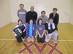 ゲームは、大久保家、中村家、坪井家、木村家、鈴木家、福田家、宮沢家、河村家、庭野家の9つの家族に分かれて(私もしっかりと婿養子をもらうことができました。)A・B・Cブロックごとに闘いが繰り広げられました。そして、さらに各ブロックの1位、2位、3位同士が対戦という白熱したものとなりました。3店のメンバーが入り交じってつくられた家族構成によって文字どおりの交流戦となり、公式戦で活躍している人、長年プレーはしているけれども外の大会には出ない人、まだ始めたばかりの人、それぞれが楽しめたとてもよいゲームでした。優勝の福田家、準優勝の中村家を初め、全部の家族、全員が賞品をいただき、みんな大満足、とても充実して昼の部を終えることができました。全員の賞品をご提供くださった、酒井さんにはとても感謝しています。 | ![]() |