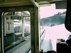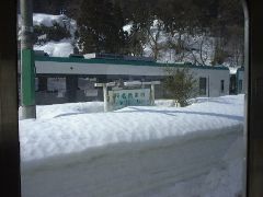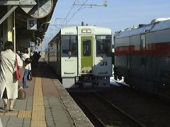 春分とはいえまだ雪深し。交換待ちしてくれた酒田行き気動車の下半分が雪で見えません。 |