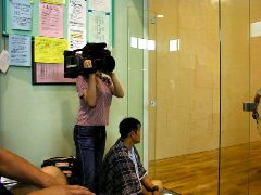 地元のCATV(グリーンテレビ?)美人カメラマン兼レポーターが取材に来ておりました。 最近オープンしたコートなので日本で施工を受注する業者などなかったのではないかと心配したのですが空調、マイク、床、壁ともよく整備されておりました。今回自らも出場されている中嶋支配人自ら適切な指示を与えたのではと、ご苦労を邪推しております。 |