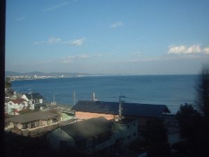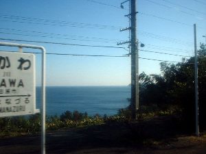 1時間過ぎて景色が湘南ぽくなってきました。小田原の次の早川駅付近では目の前に相模湾が広がります。