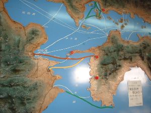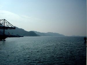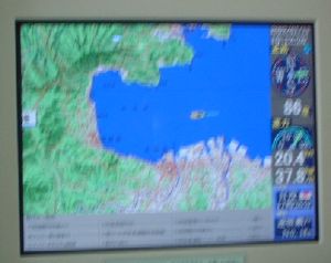 四国に抜けて行くことにしました。(左から2枚目の写真の赤い航路)