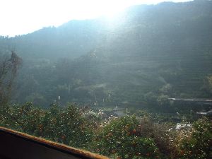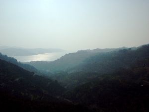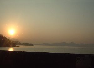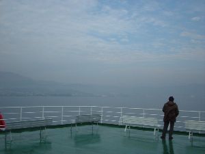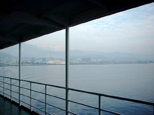 もやのかかった阿蘇山と別府市内が船内デッキからだんだん小さくなっていきます。