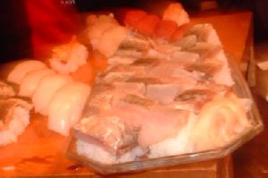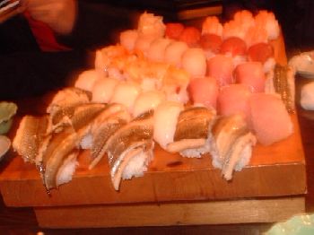 しかし・しかしTakky強し。 DARA同好会主催「春のラケットボール大会」結果 決勝でも高校生の息子さんの前で柳沼氏を破って優勝です。やむをえず乗った上越新幹線の終電前にTakky親子、Kotakky、俺だぜさんと地元「鞍馬鮨」へ行きました。ちょっと奥に入ったいかにも穴場という雰囲気がします。このボリュームをみてください。ネタの良さはともかくシャリの良さはさすが新潟です。今までの寿司は何だろうと思わせる絶品な味わいでした。