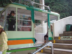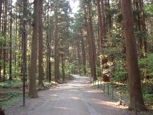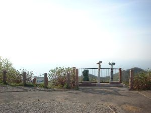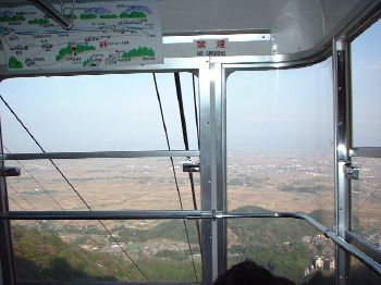 せっかくですのでロープウェーで634mの山頂をめざすことにしました。杉並木の土の道を10分ほど進むと乗り場です。田植え前の越後平野は土色ですが、もう1ヶ月すればこれが緑色で覆われることでしょう。