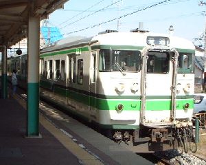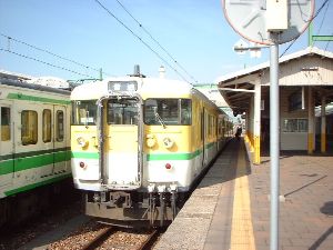 ダッシュの前の旧街道を横断して、坂道を上り、落ち着いた住宅街を右側へ歩いていくと、JR越後線、寺尾駅に着きます。電車がやってきました。関東を走っている1世代前の近郊形と同じ電車ですが、JR東日本新潟支社は白地に緑も塗り分けが特徴です。寡聞にしてその由縁を知りませんがおそらくコシヒカリと水田でのその色をイメージしたものと想像させます。40分ほど走ると弥彦への乗換駅の吉田駅です。新潟〜寺尾駅あたりで15分間隔だったダイヤはここまでで30分間隔となり、ここからは1時間以上の間隔となり信越線柏崎へのんびり抜けていきます。弥彦に行く電車はここから分かれていきます。誤乗防止のため上半分が黄色に塗られています。