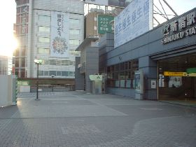 行きにはパフォーマンスで溢れていた新宿駅南口広場には早朝の日差ししかいませんでした。