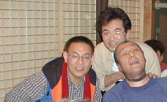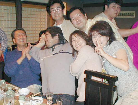 美脚に刺激されて、宴会でも網タイツが大人気。明日のJARA総会を控えて緊張の杉本理事(関西)も大喜び。