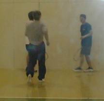 サンピア多摩のコートは3面で床はゴールドジムと同じビニールが貼られています。フロントウオールはパネルを貼りあわせて隙間を細いスペーサで埋めています。