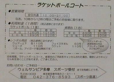 大浴場(光明石温泉、有料\600)もあり設備が豊富です。しかし民間のクラブに比べ高値設定、ゆったり・おっとりしていてやっていけるのだろうか?などと心配になってしまいます。ラケット愛好者で1時間1890円のコート料金を払ってプレイする人はいないかもしれませんね。創設当初の価格設定を替えてないのかもしれません。