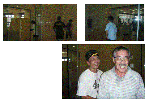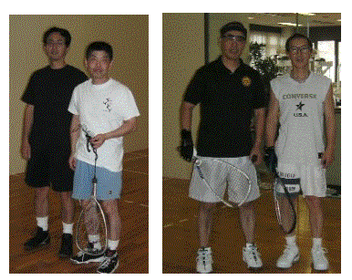 おや、どこかで見た方がいます。最初で最後のラケットボールレッスンブックを書かれた石黒チャンピオン(右,第1回全日本選手権1980年優勝、サンノゼ世界選手権代表)が出場されてました。試合前は良く読んだなあ。
