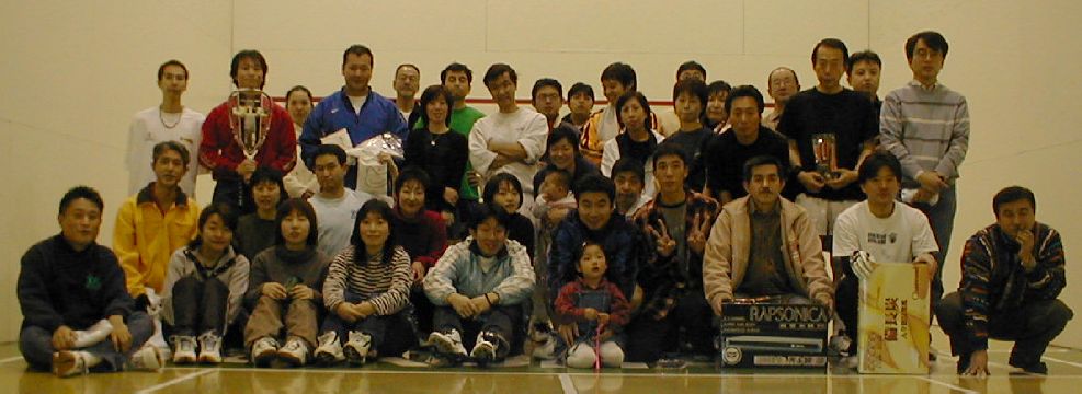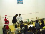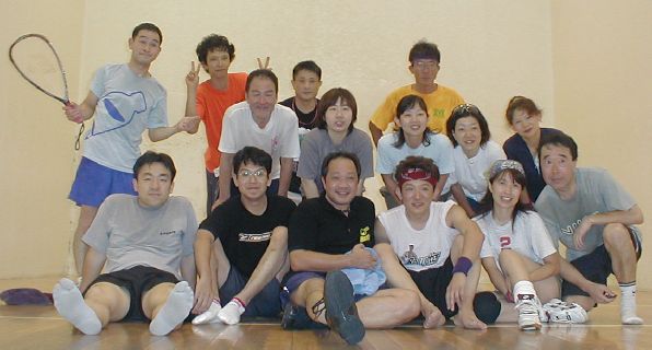 #14(04/12/12)マスターズ イン ナニワ2004 マスターズに参戦して始めての関西開催。初日のYMCA会場は通路をはさんで2面あり、Aコートが左右壁の後ろ半分がガラスです。スタジオやエアロバイクでエクササイズしながらラケットボールをチェックすることができます。オープン以来初めての試合開催だそうです。 世界選手権代表を擁する4組の本命と思われていましたが、MIXダブルスは大決戦を次々に制した柏城・松本(ビック緑)ペアが優勝しました。インタビューをご覧下さい。