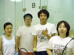 最近はコナミ各店で営業時間短縮、定休日増、お得なチケット次々廃止で、よっぽど苦しいのかしらんと心配させておりますが、なんと中間決算で連結利益前年比41%増とのこと。2005年3月期中間 連結業績のお知らせ 11/2日経17面の山本コナミ社長によると、 「直営のスポーツ施設の会員数は前年同期割れだったが、老朽施設の閉鎖に加えて「量から質へ」と会員獲得競争がし烈になるなかで客単価の上昇に戦略転換を図ったためだ。2004年9月中間期決算は連結純利益が8億5千万円と前年同期に比べ41%増えた。「残念ながら決勝に残った程度かな」と控えめな評価だが、「後半に追い込めば通期では金メダル」と業績拡大に向け確実に追い風を感じているようだ。(引用終わり)」 ・・・業績が良かったのはホッとしましたが、さらなる利益の追求は株主にとっては良いことですが、老朽施設、不採算店にあるラケットボール愛好者さんは店舗スタッフに与えられる厳しいノルマに協力する必要があるかもしれませんね。一番心配している店舗で来週マスターズがあるので何か情報が得られるかもしれません。 #11(04/10/09) 全日本/関口さんの里帰り 3連休初日を襲撃した台風22号ですがRCO速報(マニさん)によると全日本結果(JARA)はがんばって開催しているようですね。JARA掲示板も無期限休止中ですので速報頼りにしております。選手のみなさんは今日のお宿に帰れるでしょうか?さて8月の話で恐縮ですが北海道でスポーツ関係を学んでいる関口さんが帰省(RBセラピー?)のためコナミ市川に帰って来られました。思う存分RBを楽しんでいただき、夜は韓国料理をおなか一杯堪能していただきました。