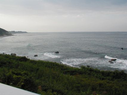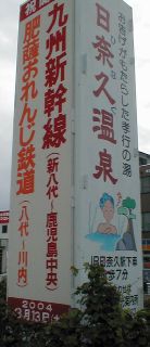 風光明媚な区間(八代−川内)は「肥薩おれんじ鉄道」へ移管されます。(左)さすがにローカルな八代駅。イ草、夏みかんで有名、駅前の軽自動車駐車、駅前写真右の製紙工場が印象的でした。鉄ちゃん界では「各駅停車一日でどこまで遠く行けるか?」の謎のお答え駅でも有名です。次のトリビアにも出ますよ。<横浜0時10分発で7回乗り換えして1300km、23時19分に到着します>(中央)さすがに、この駅ではなく新幹線の起点駅は一駅先の新八代に設けられています。(右)