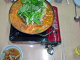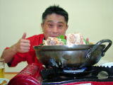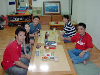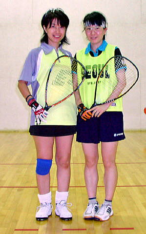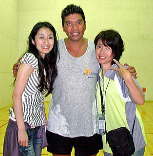 日韓以外では台湾(5名、下左写真真中2名)フィリピン(下左2写真中)、中国が1名の参加でした。その中でフィリピン選手はひとりでシングルス4連勝して見事予選リーグを突破しました。パワフル&ワイルドでした。汗びっしょりではるみさん親娘とポーズです。試合終了後は骨付き豚肉鍋でさらに日韓友好を深めました。