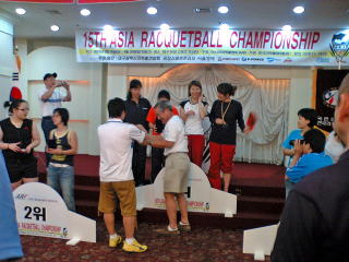 予選リーグを勝ち抜いた選手はもっと大変で、朝8時からタイブレにつぐタイブレの決勝トーナメントを戦い表彰式会場に着いたのは夜8時・・・・。表彰を受けたらすぐお開きとなってしまう気の毒な状況でした。お疲れ様でした。第2日にも書きましたように男子は韓国、女子は日本がタイトルを分け合いました。