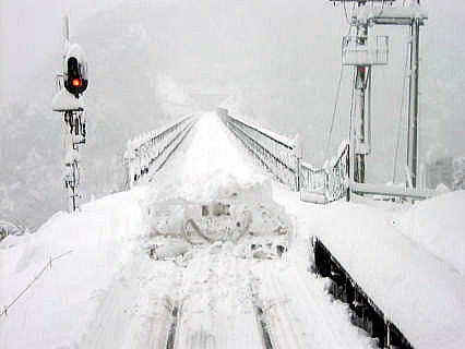 2mm大の大粒に雪は変わっていました。線路上に埋もれるように積もっていきました。餘部鉄橋を越えて2つめの峠越にエンジンの回転を上げて前進にトライするも、ついにスピードは落ちていきます。ついに餘部−久谷間上り坂で停止しました。H運転士は10分以上懸命に雪かきし、再度エンジン回転をフルに上げましたたが車輪は空転し前進不能となり運転所の指示をあおぐことになりました。どうも大粒の粉雪がレールと車輪の間に挟まり粘着力がとれなくなったようです。