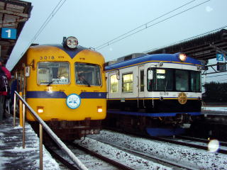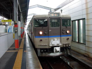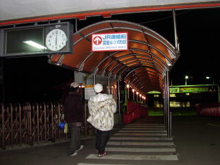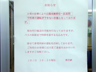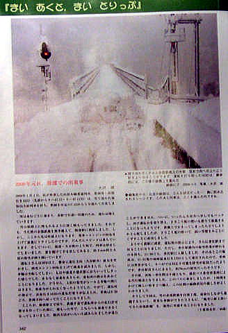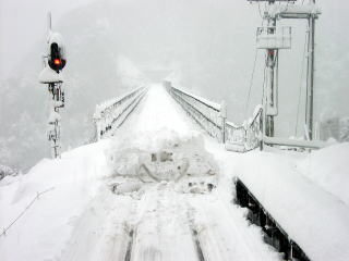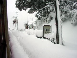 脱出方法がいろいろ試みられましたが進むことができません。ついにいったん久谷方向に前進し、再び運転台を鎧駅方に代わり積もった雪を潰して前進することになったようです。我々乗客は鉄橋で止まったらどうしようかと心配しましたが、坂の反動で高い雪壁を見事に潰して成功しました。 鎧駅に到着、運転所の指示により香住駅まで戻ることになったが、除雪担当のJR社員を待つために停車しました。H運転士と除雪掛JR西社員3名とスコップを持ってキハ47前を除雪しました。そうしているうちに雪なのに落雷する不規則な気候になりました。しかし運転所の指示により他の除雪作業を待って発車するよう待機指示あり、待っていました。2時間20分後、進みましたが、今度は香住駅除雪作業を待ち場外鉄橋上で待機することになりました。 香住駅に入線。その列車は11時51分発城崎温泉行として異常なく運行されていました。70cmの積雪だったそうです。 運転士なのに雪かきを厭わず、保線掛と協力して安全第一、冷静かつ機敏な行動のH運転士、大変ご苦労様でした。JR西は頑張ってます。データ:(餘部方)キハ47−13+キハ47−1133(香住方) |