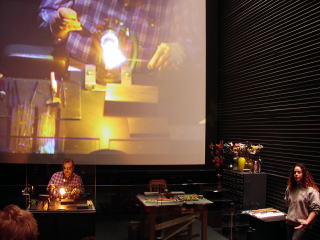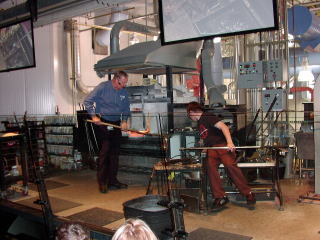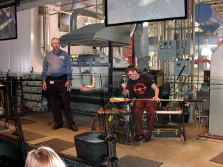 ガラス博物館に行きました。花瓶つくりの実演。鉄棒の先端のガラスをまわしながら吹いて膨らまします。