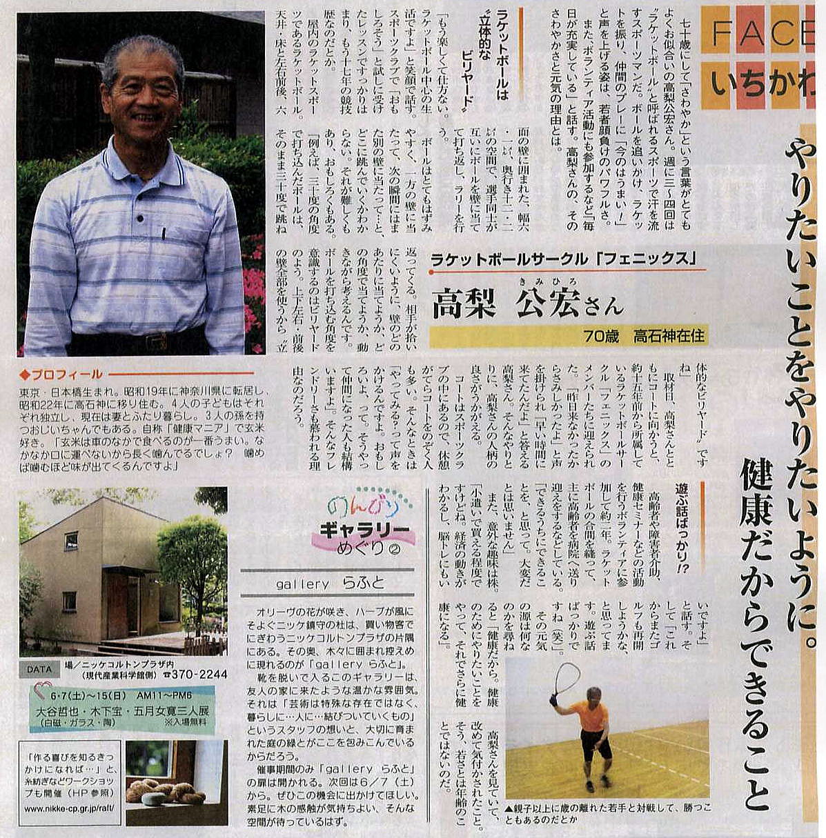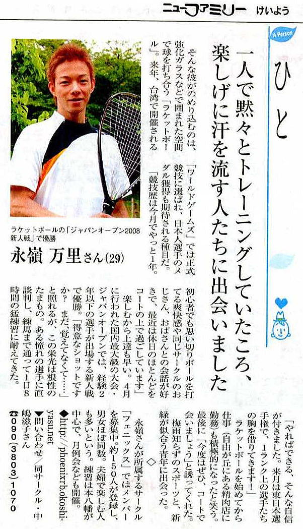 「ひと」というコーナーに、ジャパンオープン新人戦で優勝した新鋭永嶺君が取り上げられました。ラケットボールやフェニックスの方々との出会い、そして目標に向かっての猛練習のことなどを語っています。